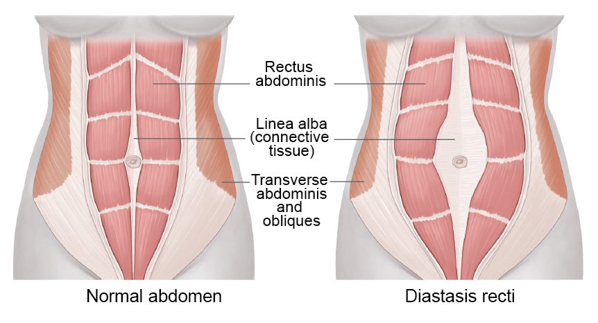 Lets start with getting to know the layers of your abdominal muscles. The four main muscle groups are the Rectus Abdominus, the External Obliques, the Internal Obliques, and the Transverse Abdominus. All of these muscles come together at your midline, called the linea alba, where connective tissue joins them together. During pregnancy, these muscles and connective tissue all stretch as baby grows within your abdomen, but at some point, when the abdominal muscles reach the limits of their elasticity, the connective tissue is forced to separate to accommodate the baby. This separation, or gap, is what we Diastasis Recti.